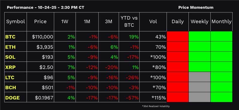Last week we discussed some of the relevant macro drivers and threw out levels to watch like 3,800 ETH, and 108k BTC. – Holding at the time of writing, and a quick check of the performance dashboard has BTC +2% on the week. Breathe in, breathe out. You can almost feel the energy building.
